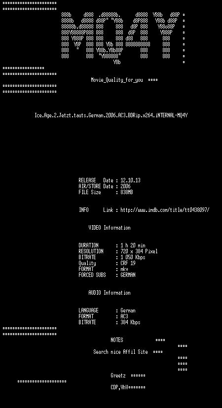 | FiLENAME: | Ice.Age.2.Jetzt.tauts.German.2006.AC3.BDRip.x264.iNTERNAL-MQ4Y.mkv |
