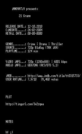 | FiLENAME: | 21 Gramm (2003) [DL 720p BD].mkv |