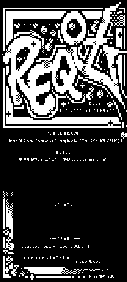 | FiLENAME: | Boxen.2016.Manny.Pacquiao.vs.Timothy.Bradley.GERMAN.720p.HDTV.x264-REQiT.mkv |