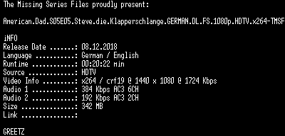 | FiLENAME: | American.Dad.S05E05.Steve.die.Klapperschlange.GERMAN.DL.FS.1080p.HDTV.x264-TMSF.mkv |