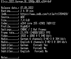 | FiLENAME: | Elvis.2022.German.DL.1080p.WEB.x264-WvF.mkv |