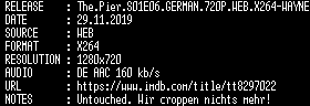| FiLENAME: | The.Pier.S01E06.GERMAN.720P.WEB.X264-WAYNE.mkv |
