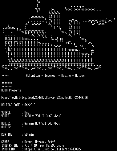 | FiLENAME: | Fear.The.Walking.Dead.S04E07.German.720p.WebHD.x264-AIDA.mkv |