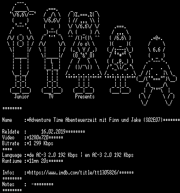 | FiLENAME: | Adventure.Time.Abenteuerzeit.mit.Finn.und.Jake.S02E07.German.DL.720p.WEBHD.x264-JuniorTV.mkv |