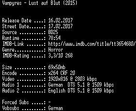 | FiLENAME: | Vampyres.Lust.auf.Blut.2015.German.DL.1080p.BluRay.x264-SPiCY.mkv |