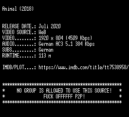 | FiLENAME: | Animal.2018.German.1080p.WEB.h264-SLG.mkv |