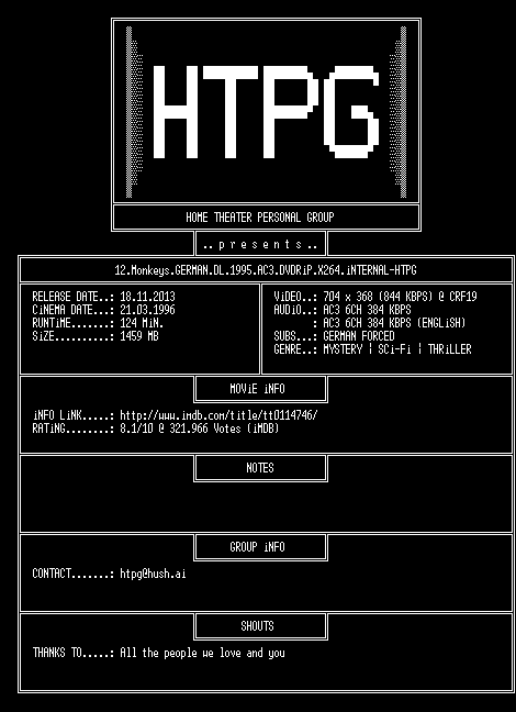 | FiLENAME: | 12.Monkeys.GERMAN.DL.1995.AC3.DVDRiP.X264.iNTERNAL-HTPG.mkv |