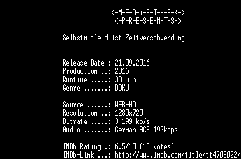 | FiLENAME: | Selbstmitleid.ist.Zeitverschwendung.German.DOKU.720p.WebHD.h264-MEDiATHEK.mkv |