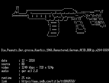| FiLENAME: | Die.Peanuts.Der.grosse.Kuerbis.1966.Remastered.German.AC3D.BDRip.x264-GSG9.mkv |