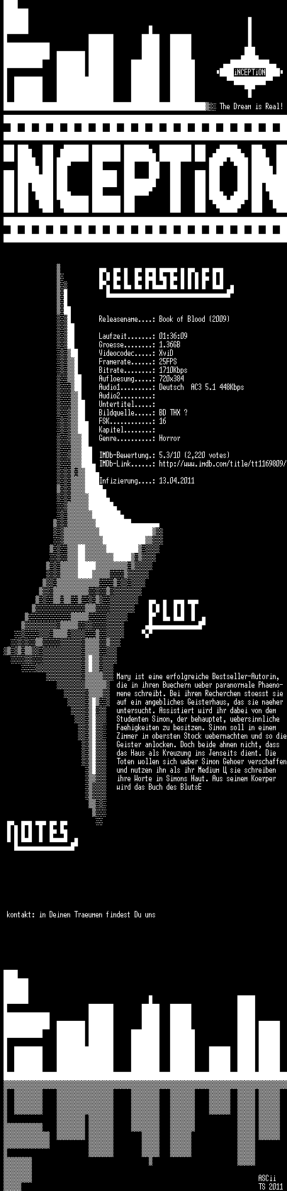 | FiLENAME: | Book.of.Blood.2009.German.AC3.BDRip.XviD-iNCEPTiON.avi |