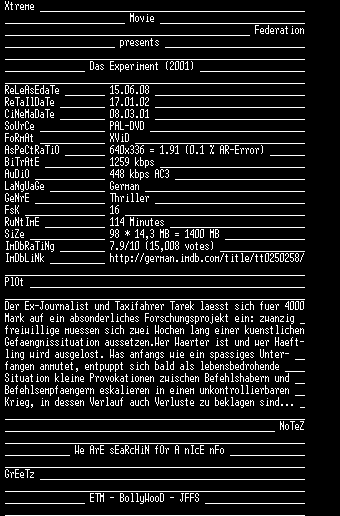 | FiLENAME: | Das.Experiment.German.2001.AC3.DVDRiP.iNTERNAL.XViD-XMF.CD2.avi |
