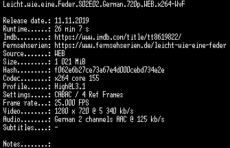 | FiLENAME: | Leicht.wie.eine.Feder.S02E02.German.720p.WEB.x264-WvF.mkv |