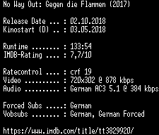 | FiLENAME: | No.Way.Out.Gegen.die.Flammen.German.2017.AC3.BDRip.x264-COiNCiDENCE.mkv |