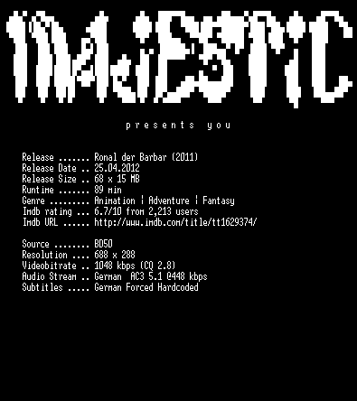 | FiLENAME: | Ronal.der.Barbar.2011.German.AC3.BDRip.XviD-MAJESTIC.avi |