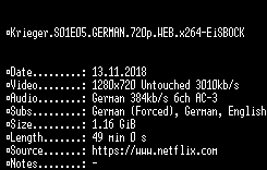 | FiLENAME: | Krieger.S01E05.GERMAN.720p.WEB.x264-EiSBOCK.mkv |