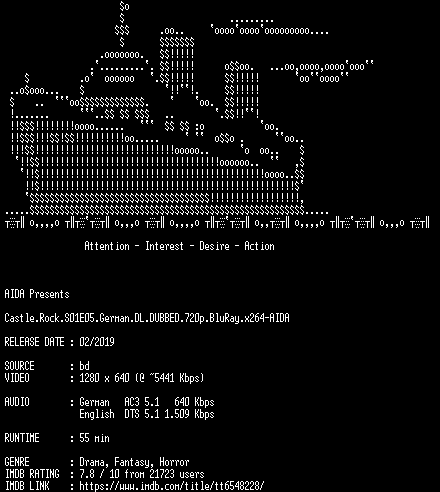| FiLENAME: | Castle.Rock.S01E05.German.DL.DUBBED.720p.BluRay.x264-AIDA.mkv |