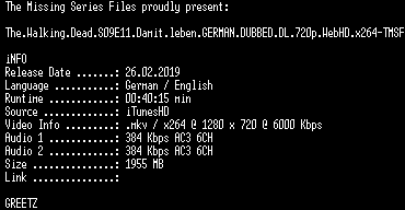 | FiLENAME: | The.Walking.Dead.S09E11.Damit.leben.GERMAN.DUBBED.DL.720p.WebHD.x264.iNTERNAL-TMSF.mkv |