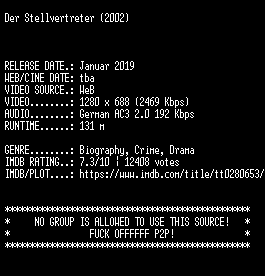 | FiLENAME: | Der.Stellvertreter.2002.German.720p.WebHD.x264-SLG.mkv |