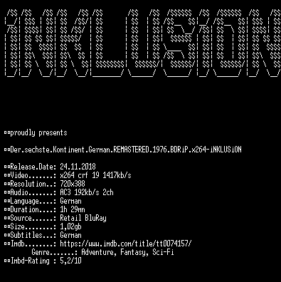 | FiLENAME: | Der.sechste.Kontinent.German.REMASTERED.1976.BDRiP.x264-iNKLUSiON.mkv |