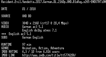 | FiLENAME: | Resident.Evil.Vendetta.2017.German.DL.2160p.UHD.BluRay.x265-ENDSTATiON.mkv |