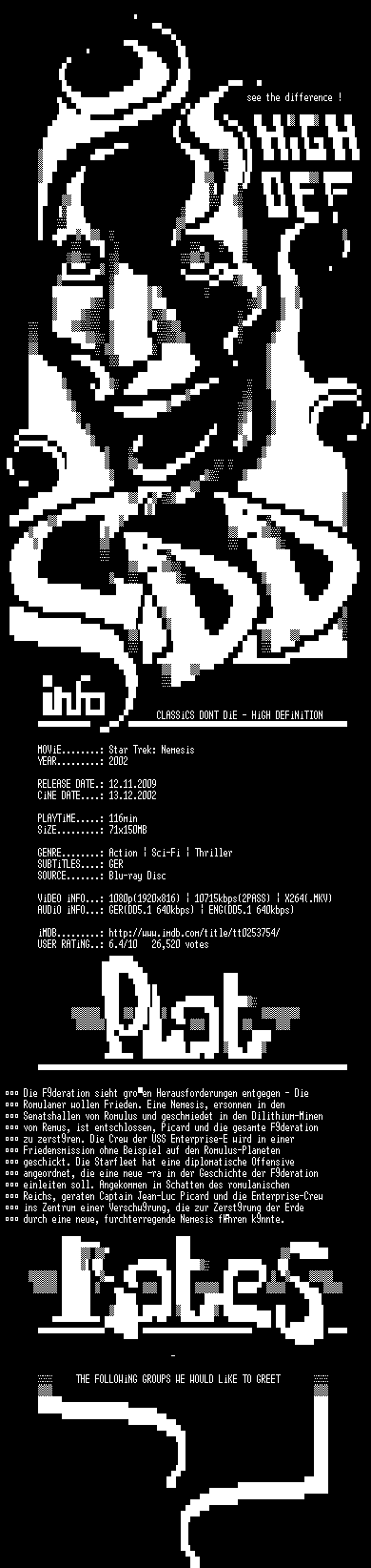 | FiLENAME: | Star.Trek.10.Nemesis.2002.German.DL.1080p.BluRay.x264-CDD.mkv |