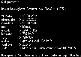 | FiLENAME: | Das.unbesiegbare.Schwert.der.Shaolin.1977.German.BDRip.x264-CWA.mkv |