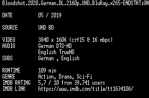| FiLENAME: | Bloodshot.2020.German.DL.2160p.UHD.BluRay.x265-ENDSTATiON.mkv |