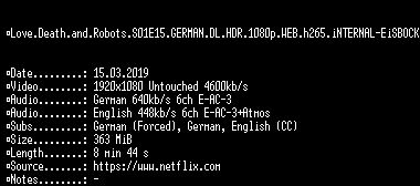 | FiLENAME: | Love.Death.and.Robots.S01E15.GERMAN.DL.HDR.1080p.WEB.h265.iNTERNAL-EiSBOCK.mkv |