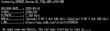 | FiLENAME: | Community.S04E05.German.DL.720p.WEB.x264-OHD.mkv |