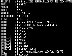 | FiLENAME: | Centauro.2022.GERMAN.DL.1080P.WEB.X264-WAYNE.mkv |