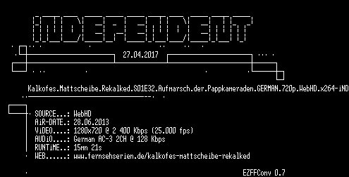 | FiLENAME: | Kalkofes.Mattscheibe.Rekalked.S01E32.Aufmarsch.der.Pappkameraden.GERMAN.720p.WebHD.x264-iND.mkv |