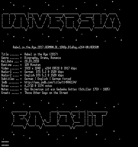 | FiLENAME: | Rebel.in.the.Rye.2017.GERMAN.DL.1080p.BluRay.x264-UNiVERSUM.mkv |