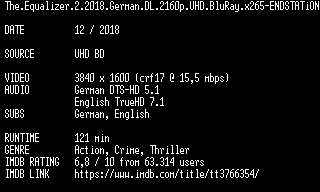 | FiLENAME: | The.Equalizer.2.2018.German.DL.2160p.UHD.BluRay.x265-ENDSTATiON.mkv |