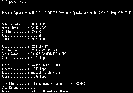 | FiLENAME: | Marvels.Agents.of.S.H.I.E.L.D.S05E06.Brot.und.Spiele.German.DL.720p.BluRay.x264-TV4A.mkv |
