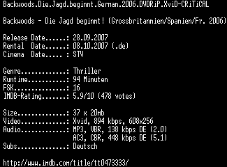 | FiLENAME: | Backwoods.Die.Jagd.beginnt.German.2006.DVDRiP.XviD-CRiTiCAL.avi |