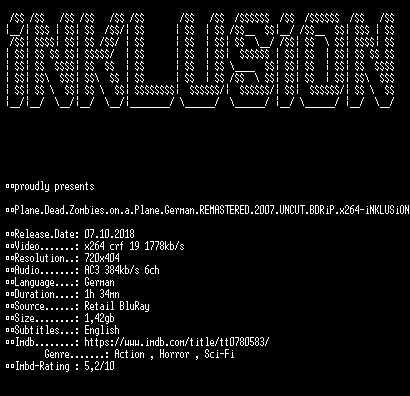 | FiLENAME: | Plane.Dead.Zombies.on.a.Plane.German.REMASTERED.2007.UNCUT.BDRiP.x264-iNKLUSiON.mkv |