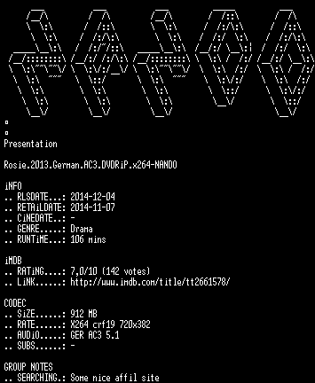 | FiLENAME: | Rosie.2013.German.AC3.DVDRiP.x264-NANDO.mkv |