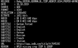 | FiLENAME: | Baby.S02E06.GERMAN.DL.720P.WEBRIP.X264.PROPER-WAYNE.mkv |