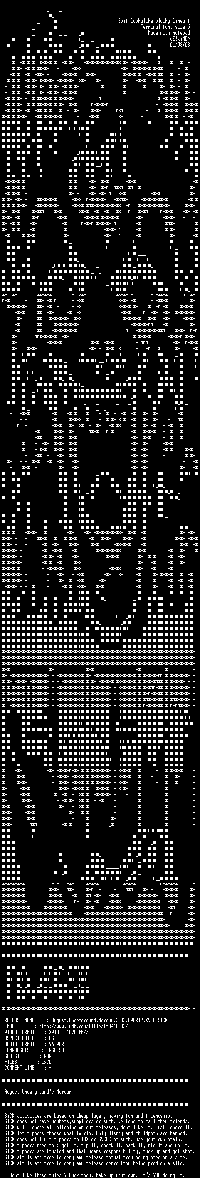 | FiLENAME: | August.Underground.Mordum.2003.DVDRIP.XVID-SiCK.avi |