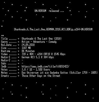 | FiLENAME: | Sharknado.6.The.Last.One.GERMAN.2018.AC3.BDRip.x264-UNiVERSUM.mkv |