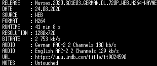 | FiLENAME: | Nurses.2020.S01E03.GERMAN.DL.720P.WEB.H264-WAYNE.mkv |