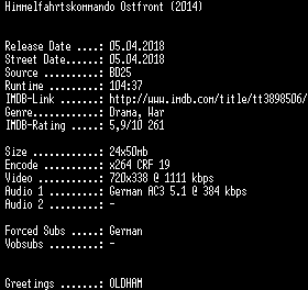 | FiLENAME: | Himmelfahrtskommando.Ostfront.German.2014.AC3.BDRip.x264-SPiCY.mkv |