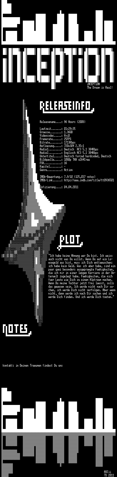 | FiLENAME: | 96.Hours.2008.German.DL.AC3.HDRip.XviD-iNCEPTiON.avi |