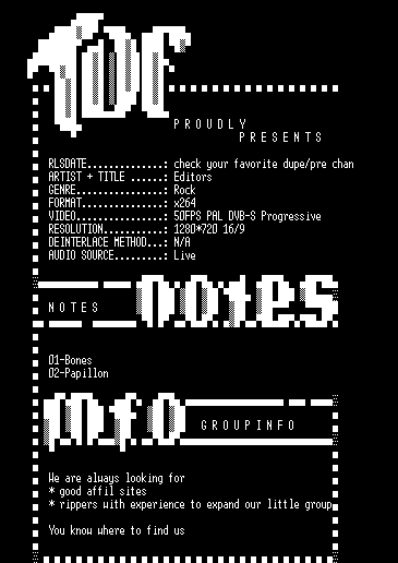 | FiLENAME: | Editors-Live_At_Rock_Werchter-HDTV-720p-x264-2010-TDF.rar |