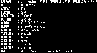| FiLENAME: | Raising.Dion.S01E04.GERMAN.DL.720P.WEBRIP.X264-WAYNE.mkv |