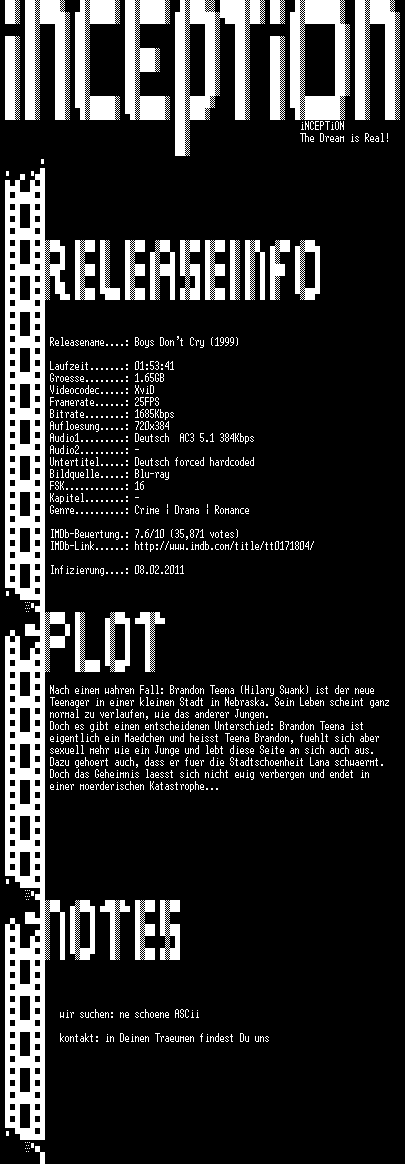 | FiLENAME: | Boys.Dont.Cry.1999.German.AC3.BDRip.XviD-iNCEPTiON.avi |