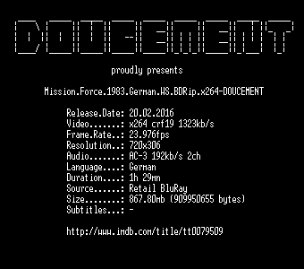 | FiLENAME: | Mission.Force.1983.German.WS.BDRip.x264-DOUCEMENT.mkv |