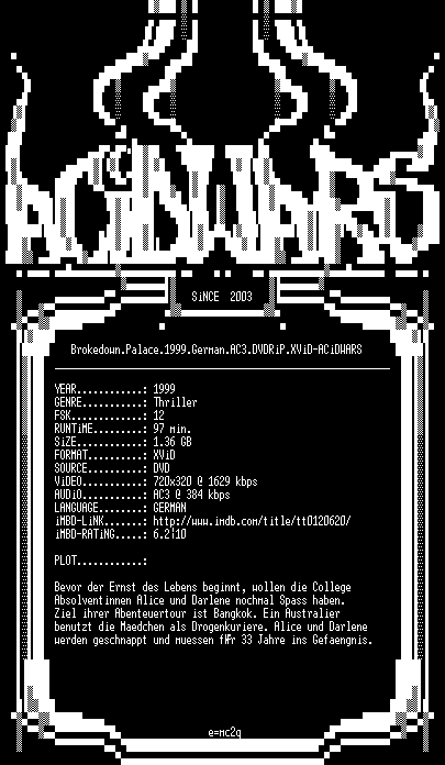 | FiLENAME: | Brokedown.Palace.1999.German.AC3.DVDRiP.XViD-ACiDWARS.avi |