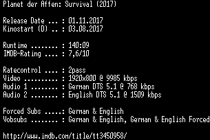 | FiLENAME: | Planet.der.Affen.Survival.2017.German.DTS.DL.1080p.BluRay.x264-COiNCiDENCE.mkv |