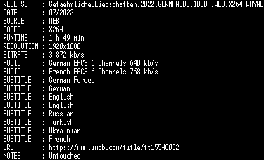 | FiLENAME: | Gefaehrliche.Liebschaften.2022.GERMAN.DL.1080P.WEB.X264-WAYNE.mkv |